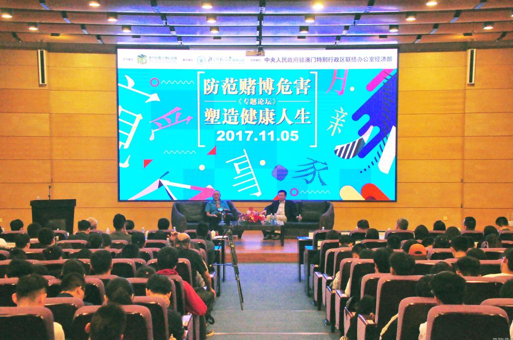 王五一教授做了《久赌必输》的主题演讲,阐述了“久赌必输”的学理依据。他认为,“久赌必输”这句话是有道理的,陷得越深,输的越惨。王长斌教授向在场师生介绍了《赌博危害及澳门特别行政区政府对赌博失调的预防措施》。他介绍了赌博的危害,详细解析了博彩业在澳门形成与发展的历史根源,以及该产业的局限性。他提及,澳门特区政府将防止赌博失调作为政府的施政目标,并采取一系列预防措施,包括:开展公共意识宣传;培训员工识别及帮助问题赌徒;“自我隔离”措施;禁止21岁以下人员进入赌场;禁止博彩广告等等。现场互动环节,两位教授详细解答了同学们提出的问题。