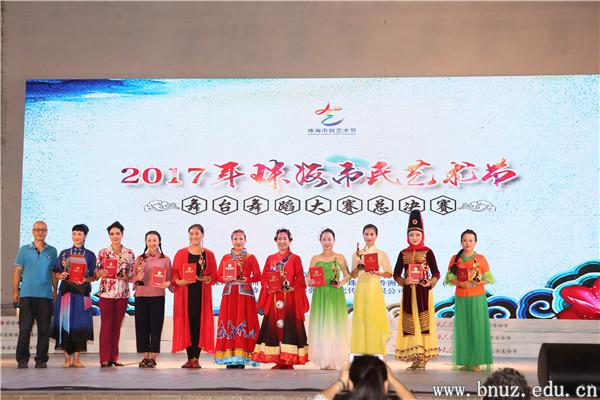 本网讯(通讯员 刘叶)11月11日,2017年珠海市民艺术节舞台舞蹈大赛总决赛在香洲文化广场举行。由永利官网工会组建的京师艺术团(舞蹈队),在原工会副主席贾素娟老师的带领下以及艺术与传播学院胡夏老师的指导下,通过藏族舞蹈《心声》改编的《唱支山歌给党听》节目,荣获总决赛二等奖和珠海市十大优秀团队奖。