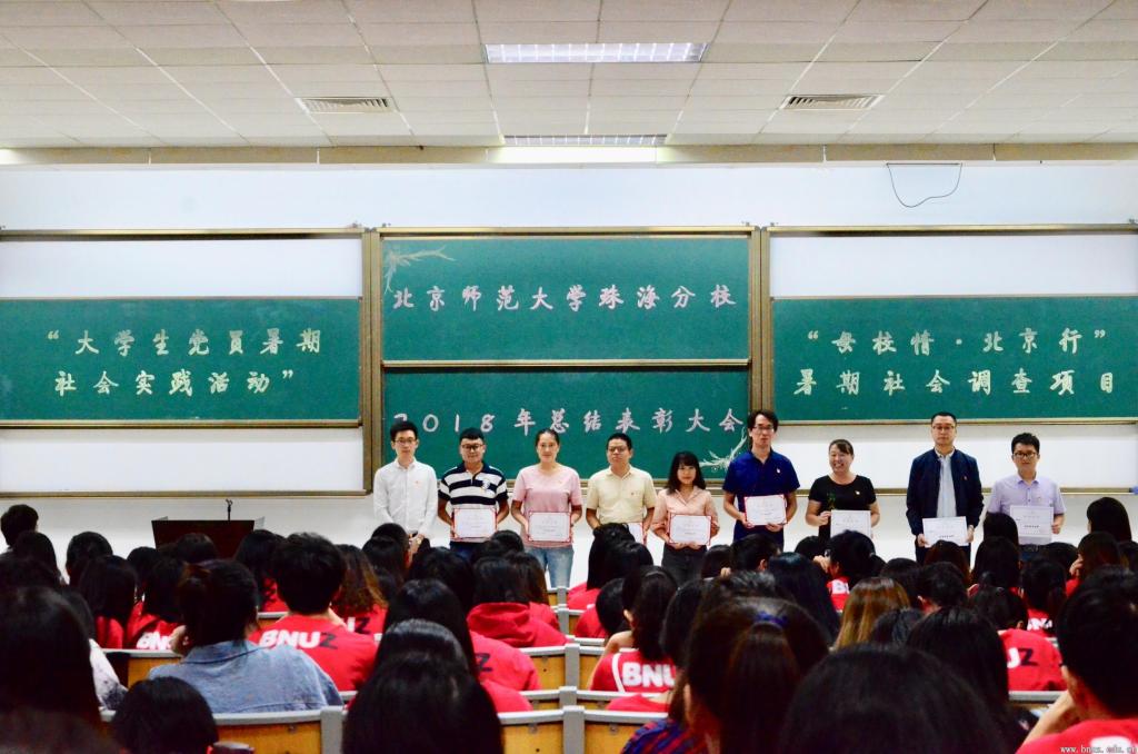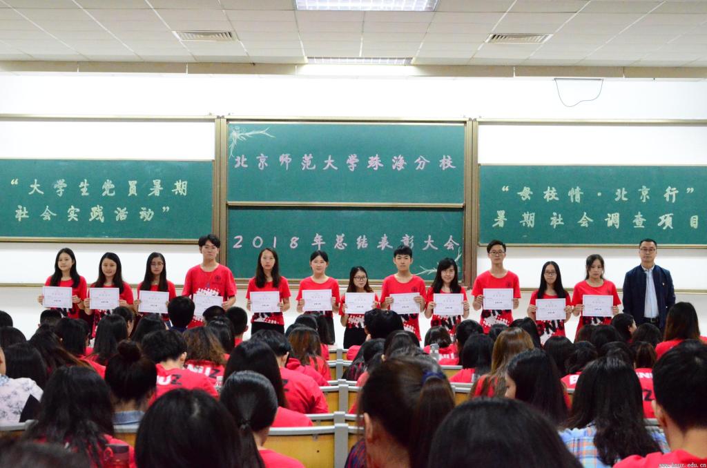 大会表彰了“北京行”优秀带队老师及优秀学生负责人、优秀学生干部、优秀学员、优秀班级、优秀小组、H5设计大赛获奖团队,及大学生党员暑期社会实践优秀指导老师,并授予了广东省教工委大学生党员暑期社会实践立项项目“红色基因星火相传 木铎青年从“心”出发——寻粤北红色文化,传革命先烈精神”研究生处“木铎青年”实践队、设计学院黔东南民族文化探寻队、工程技术学院“满腔爱国情,十颗红色心”、信息技术学院“‘党心’移动端软件开发小组”、国际商学部“一带一路小分队”等五个实践队“最佳团队”称号,对结项的11个党员实践队颁发了结项证书。