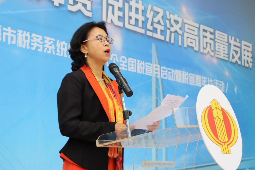 文英在致辞中表示,税收嘉年华活动的开展将进一步普及税收政策,特别是充分发挥广大师生的带头作用,将中央正在部署推进的减税降费政策带进千家万户,进一步发挥税收普法教育示范基地的示范辐射作用。她谈到,活动启动后,税务部门将在北师大珠海分校开展第二届“税宣杯”粤港澳大学生辩论邀请赛、模拟法庭大赛等一系列主题税收宣传活动,深入普及税法,全面推进依法治税,营造良好的税收法治环境。