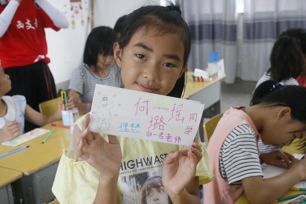 鼓励孩子发扬兴趣,用课间时光给予温情陪伴。孩子的小兴趣中承载着他们大大的梦想,经常喜欢在课下飞纸飞机的麦万鹏小朋友说他的梦想是当一名空军飞行员,为守护祖国努力,这么小的年纪,多么令人敬佩的梦想啊!课间,志愿者老师还会认真聆听孩子们的故事,和她们说“悄悄话”,用心给予孩子最温情的陪伴。