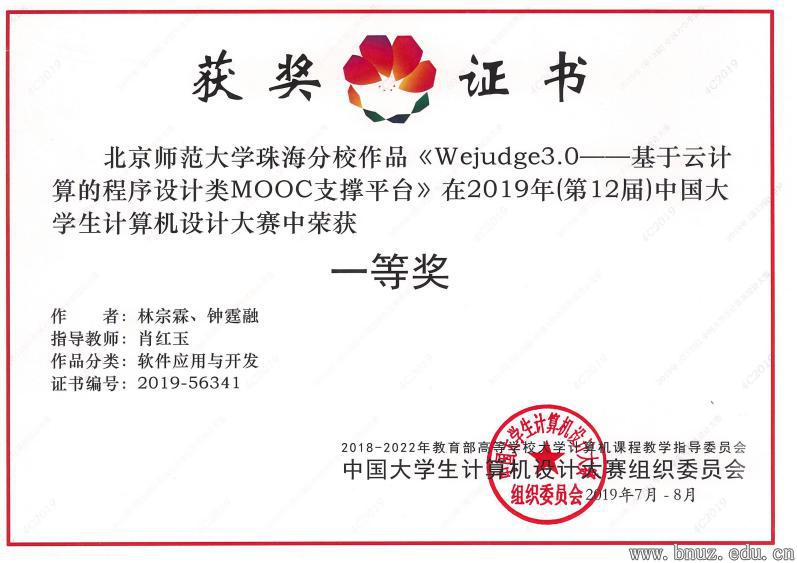 参赛作品《Wejudge3.0—基于云计算的程序设计类MOOC支撑平台》(团队成员:林宗霖、钟霆融,指导老师:肖红玉)一路披荆斩棘,在决赛中斩获全国一等奖。WeJudge是一个支持多编程语言的在线代码评测系统,将传统的在线评测融入到MOOC当中,构建了一个面向高校日常教学的在线评测教学辅助平台。平台在实时在线代码自动评测功能的基础上,增加了教学管理系统,包含班级管理、作业管理、视频教学、在线问答、在线比赛、教学资源管理、学生管理等丰富功能。平台不仅支持程序设计类课程的日常教学,也可作为其他类型学科教学辅助平台,真正实现了在线代码实时评测与MOOC的创新结合。