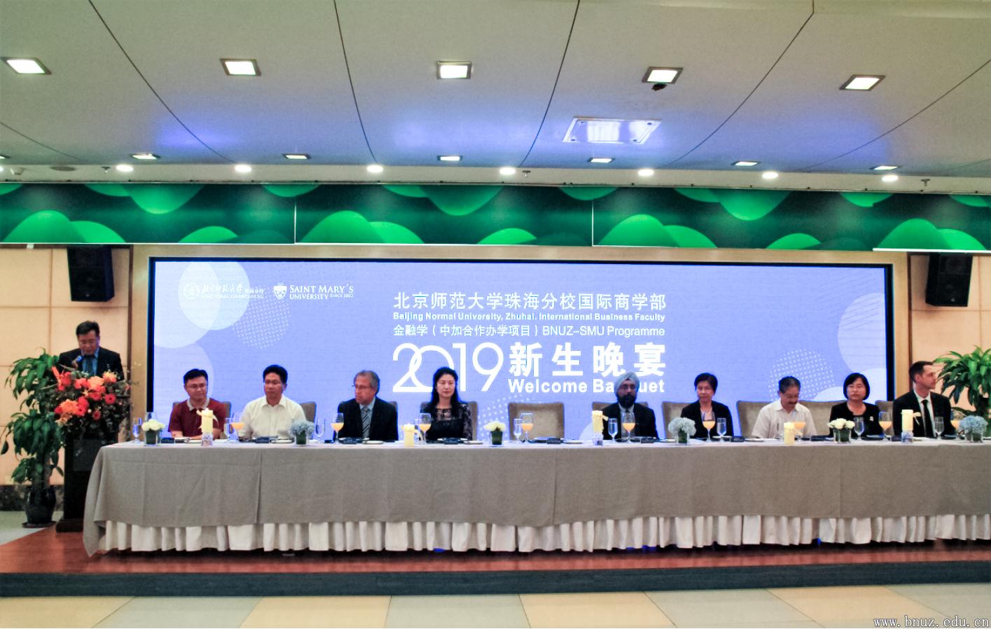 8月30日,2019级金融学(中加合作办学项目)新生晚宴暨新生训练营成果汇报在国际交流中心举办。ylzzcom永利总站线路检测党委常委、副校长珠海校区管委会主任王守军,珠海校区管委会副主任、中加合作办学项目管委会主任傅爱兰、加拿大圣玛丽大学索比商学院院长Harjeet Bhabra、国际商学部部长仲鑫、外国语学院院长陶文好、财务处处长宁少林、教务处处长胡嘉骢、国际交流与合作处处长邱月,中加合作办学项目学术主管Miguel Morales、商贸本科项目助理主任Jonathan Regan、国际商学部相关领导和教师以及2019级全体新生出席了本次晚宴。