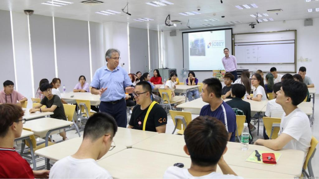 8月31日15时,Dr. Miguel Morales和Jonathan Regan在图书馆为2019级中加合作办学项目的新生带来了一堂精彩的模拟课堂。Dr.Miguel Morales教授向新生们简单介绍了加拿大圣玛丽大学索比商学院的地理位置和气候特点,向同学们展示了圣玛丽大学的图片,使同学们对索比商学院有了更深入的了解。接下来,两位老师组织同学们进行了用积木来搭起建筑的游戏,让同学互相交流了解,从而体验到团队协作的重要性。