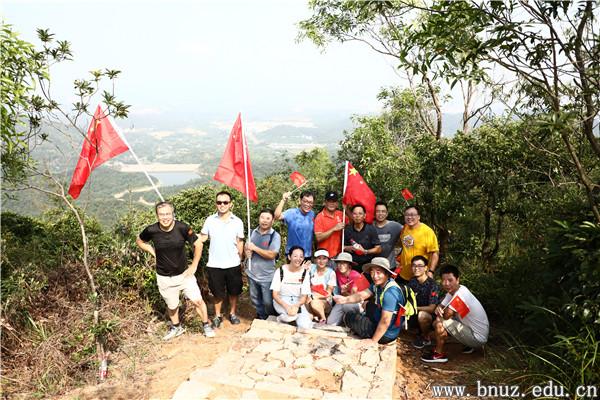 十月的珠海天气依旧炎热,百人队伍手举小红旗,向凤凰山进发。大家三五成群,或是旧识,或是新友,聊着工作,分享着生活,脚下的步伐也愈加稳健。清幽的凤凰山间忽而响起阵阵歌声,那是老师们在用爱国歌曲互相加油打气;满眼尽翠的山林间出现一片鲜红,那是各队带队老师挥舞着国旗为大家开路,全体老师挥舞着手中的小红旗行进在蜿蜒曲折的山路中。