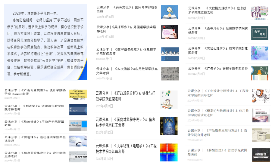 疫情防控期间,老师们积极响应学校的号召,坚持“开学不返校,网教不停学”的原则,遵循线上教学的规律,精心组织教学设计,倾力打造线上课堂,以课程传递思政育人目标,以师者风范潜育分校学子。为进一步推进信息技术与教育教学的深度融合,推动教学改革,培养和打造线上“金课”,学校组织开展线上教学经验交流会,设立“云课分享”专题。本学期,共发布“云课分享”系列专题推文82篇。通过优秀教学案例的分享,促进教师交流与优秀教学方法的推广。