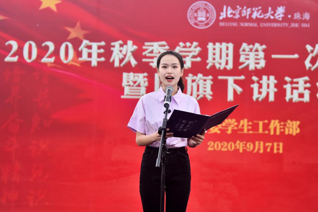 本网讯(通讯员 朱珊珊)9月7日,为上好开学第一课,加强大学生的爱国主义教育和社会主义核心价值观教育,学校举行2020-2021 学年秋季学期第一次升国旗仪式暨国旗下讲话活动。珠海校区党委副书记兼珠海分校党委副书记亓振华出席仪式并讲话,各学院部党总支、直属党支部副书记,教师代表与学生代表一千余人参加了活动。升旗仪式由党委学生工作部部长李楠主持。
