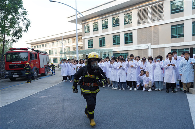 随后立即开展了危化品泄露引发实验室火灾应急疏散实训演练活动,演练在金鼎消防中队消防员的统一组织下进行,将实验室着火、统一疏散、灭火救援、现场搜救、伤员救治等场景分步呈现,重点向参加活动的师生演示了事故中如何在保护自身安全前提下救治伤员、应急处置、逐级报警等步骤。