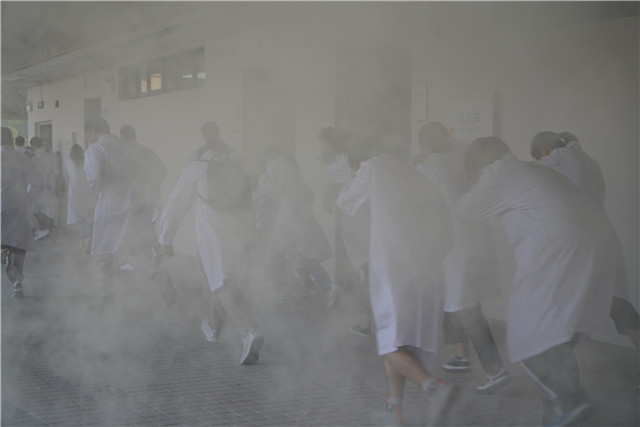 参加演练的师生一切行动听指挥,捂住口鼻,重心下移,井然有序向室外安全区域撤离;灭火救援组、疏散组、搜救组、医疗救护组各司其责,迅速快捷地扑灭火源、展开搜救和急救。