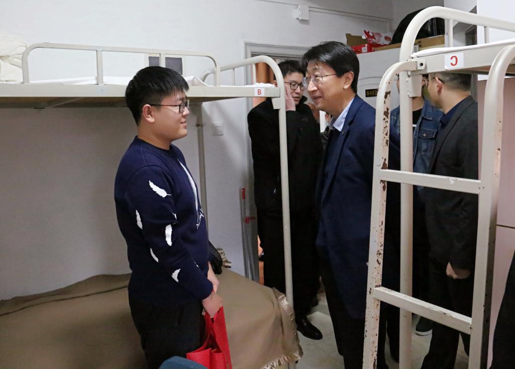 程鹏一行检查了校园疫情防控工作、校门体温检测、校园值班值守等情况,并前往文华苑学生宿舍楼看望慰问寒假留校学生。