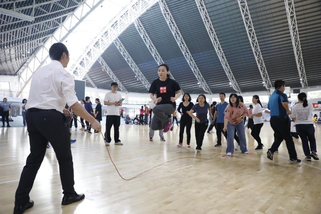 下午4点,伴随锣响枪鸣,各参赛队员迅速进入比赛状态。在啦啦队的加油呐喊声中,老师们跳动和穿行在转动的跳绳间,争分夺秒,互不相让。最后经过激烈的竞争,不动产学院摘得桂冠,未来教育学院、教育学院分获亚军、季军,行政部获得殿军。