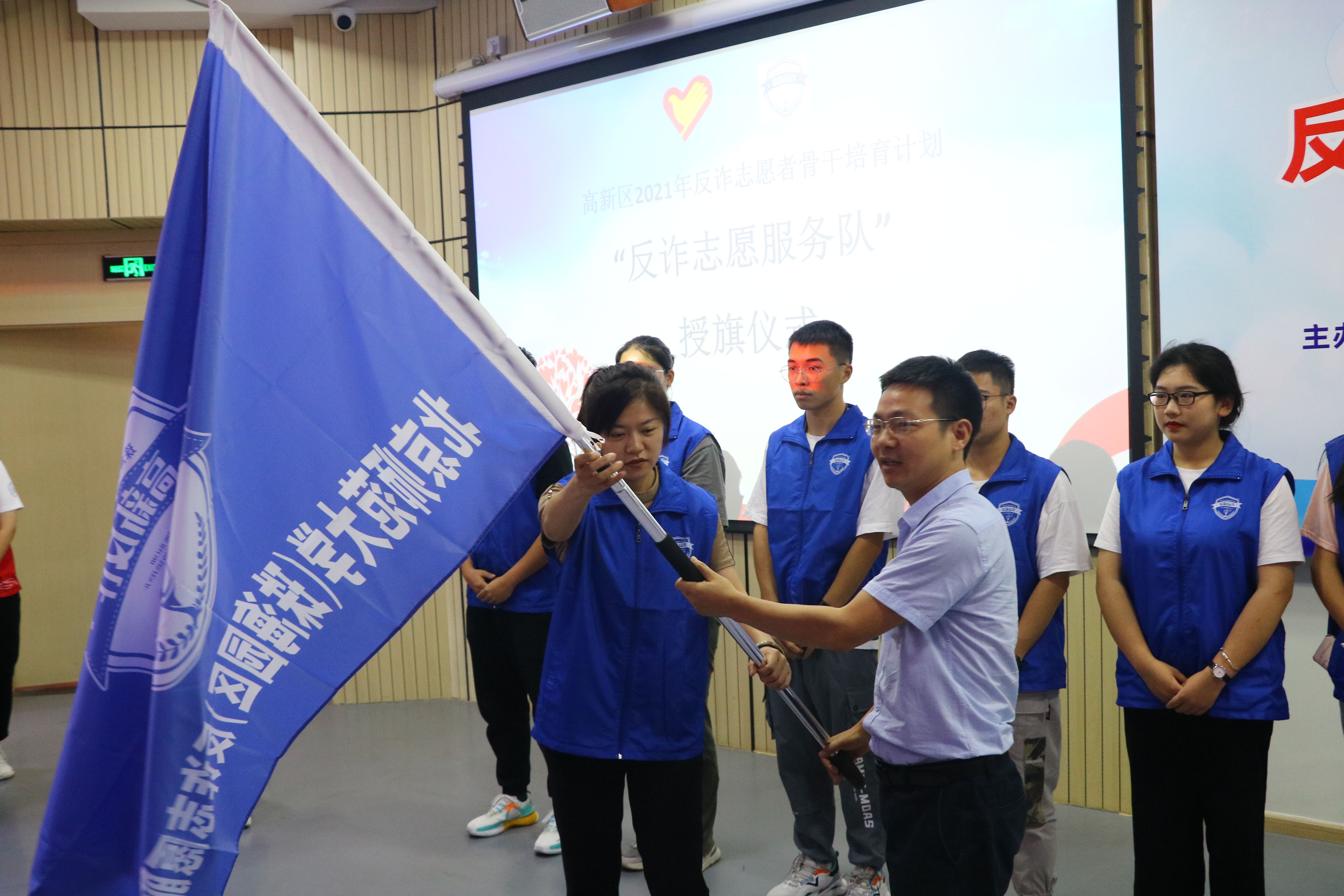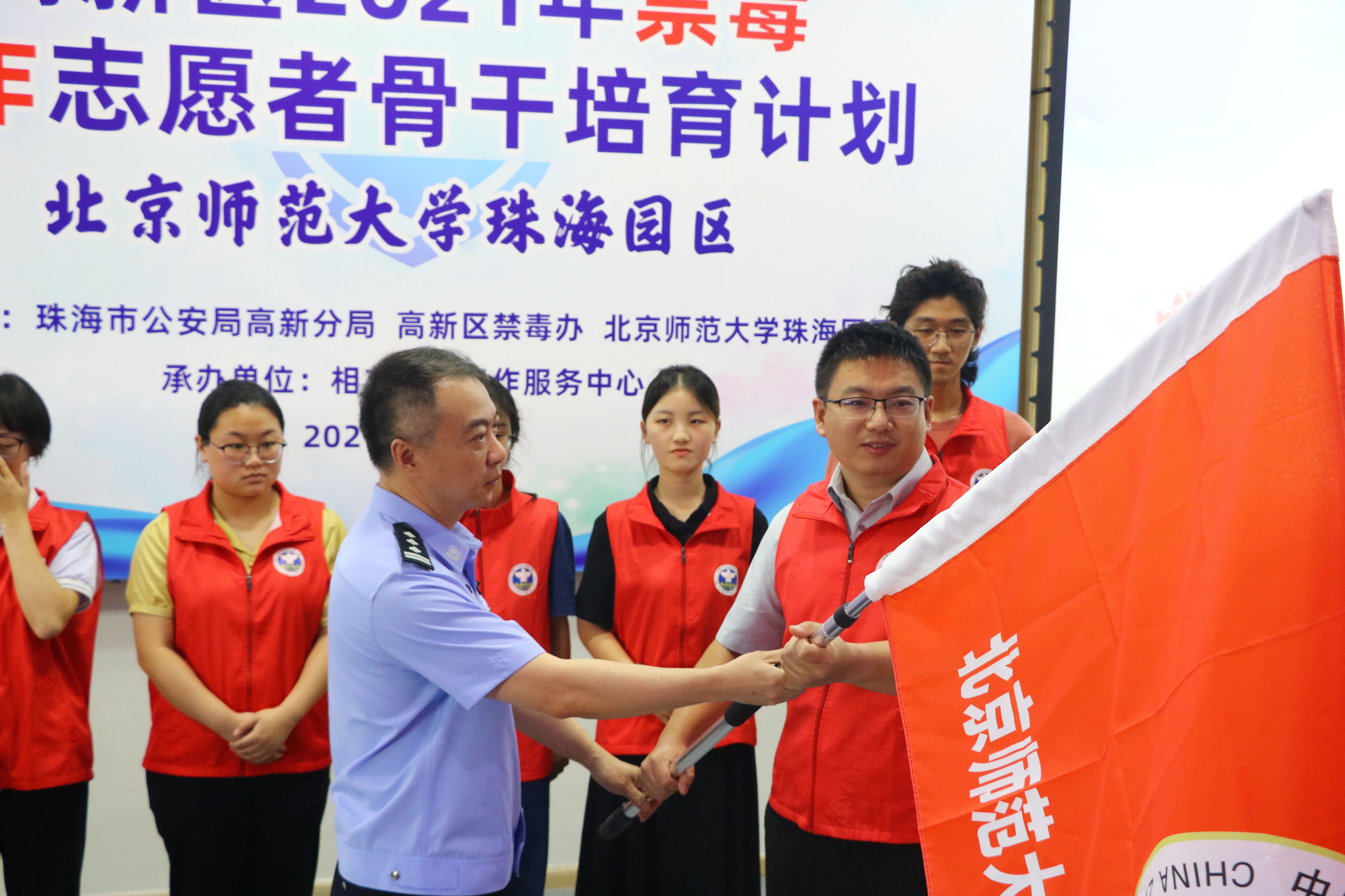 在授旗仪式上,高新公安分局副局长李勇为各学院(部)、书院辅导员教师代表颁发了“志愿者骨干”荣誉证书。北师大珠海校区管委会副主任、珠海分校党委副书记张治国简述了园区禁毒和反诈宣传教育工作情况并对大学生志愿者提出了殷切期望,希望大学生志愿者发扬“奉献、友爱、互助、进步”志愿精神,争当禁毒和反诈的实践者、宣传者。高新公安分局领导和园区领导为两支队伍授予了“禁毒志愿服务队队旗”及“反诈志愿服务队队旗”,标志着北师大珠海园区禁毒、反诈志愿服务队正式成立。