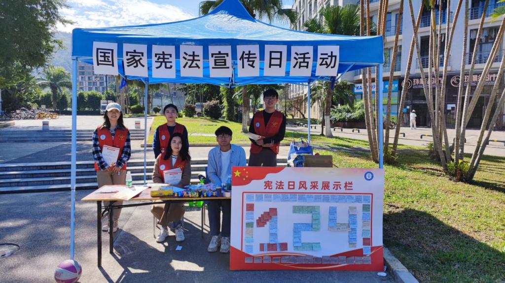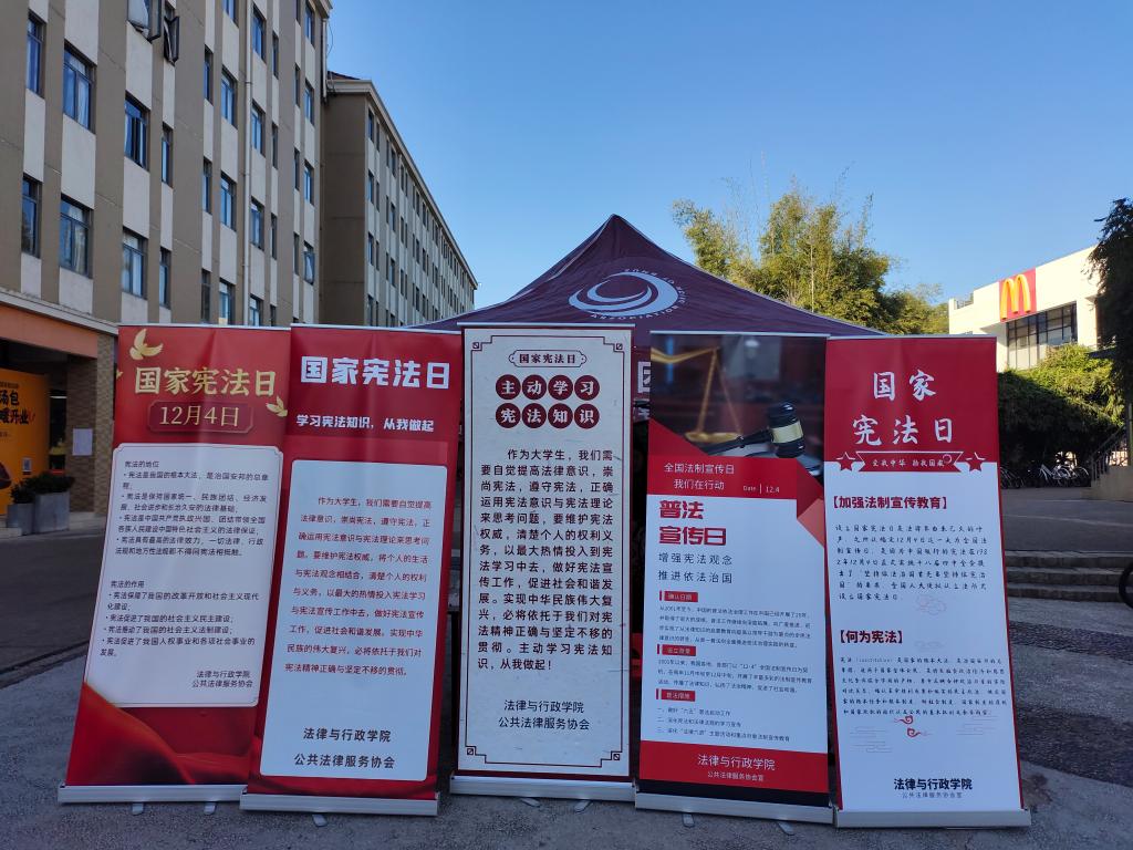 12月4日,由法律与行政学院和知行书院承办的普法宣传活动在学一食堂、学三食堂和粤华苑三栋举行。普法志愿者们通过派发宣传资料、组织有奖竞答、回答法律咨询等方式普及宪法法律知识,增强了师生们的法治观念。