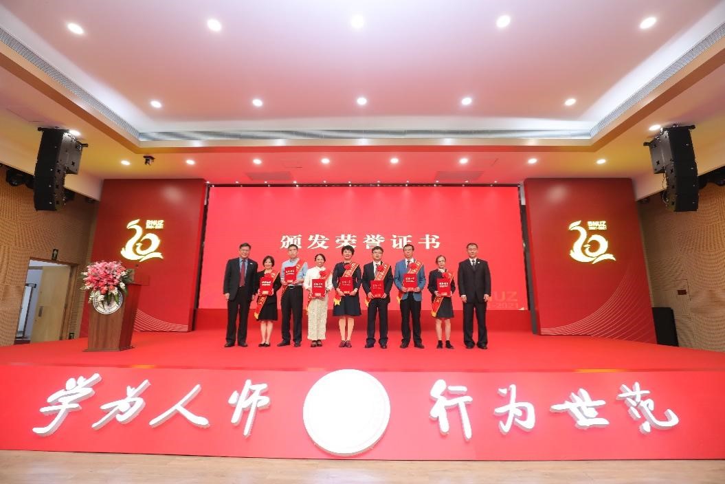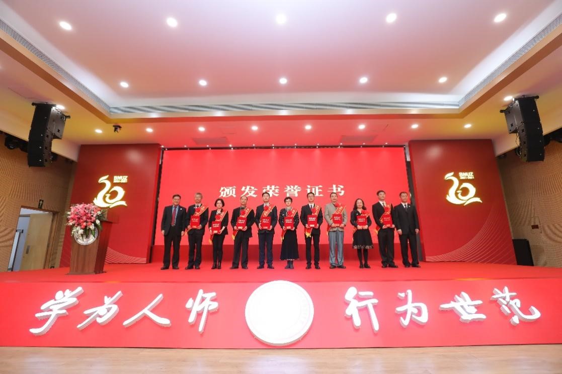 王守军、涂清云为来校工作满15年荣休教职员和在校工作满20年教职员代表颁发荣誉证书。