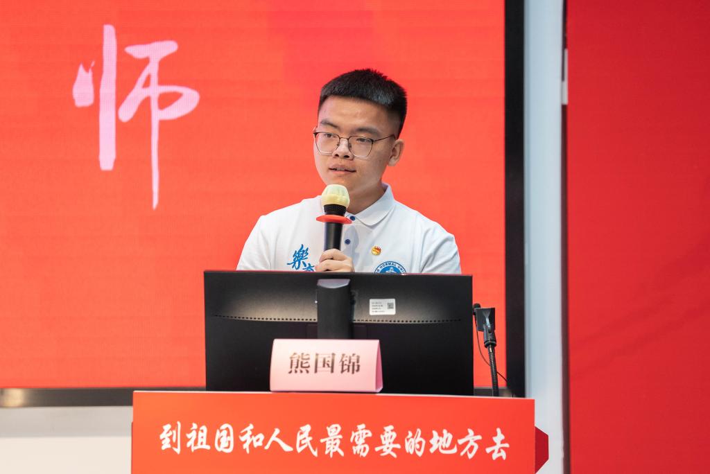 “优师计划”师范生代表熊国锦同学以“我的起点,亦是终点”为题进行发言。他表达了作为一名北师大培养的定向就业师范生,将以坚定的从教信念,到祖国和人民最需要的地方去建功立业的决心;在大学求学生活中,将追风赶月,笃行不怠,以严谨笃学的态度不断充实和提高自己,以期将来回到家乡,扎根大山教学一线的时候,能成为学生喜欢的“四有”好老师。