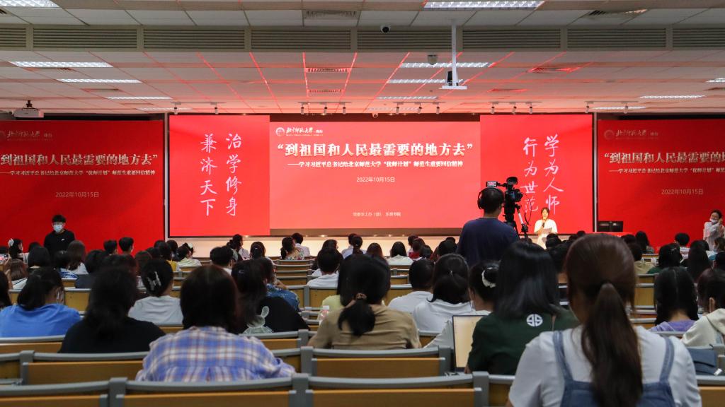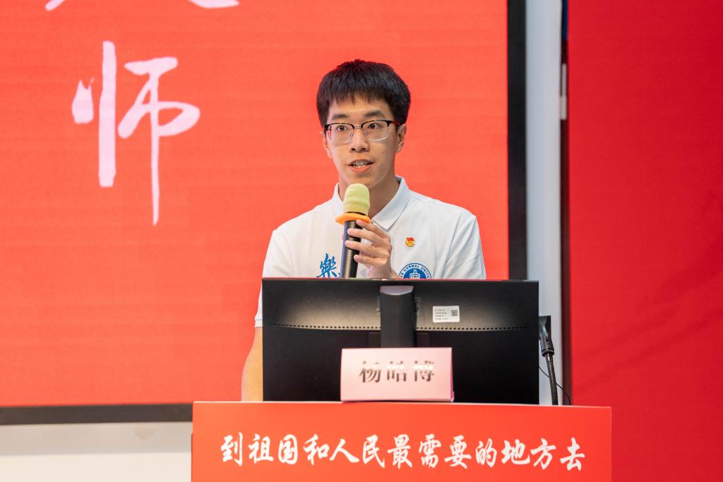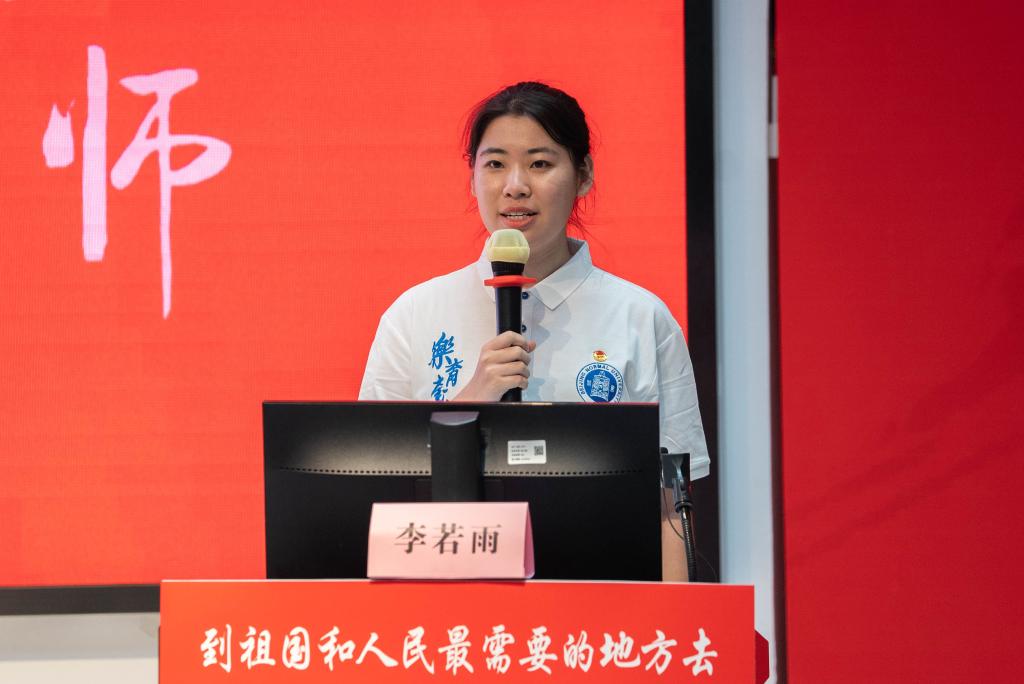 “优师计划”师范生代表李若雨同学分享了她“从霓虹灯到满天星”的故事。作为一名省来县去的师范生,她希望自己能在北师大红色基因的浸润下,通过对教育的热爱和对教学的热情奔赴未来的教师岗位,到祖国和人民最需要的地方去教书育人,以实现更有价值的人生。