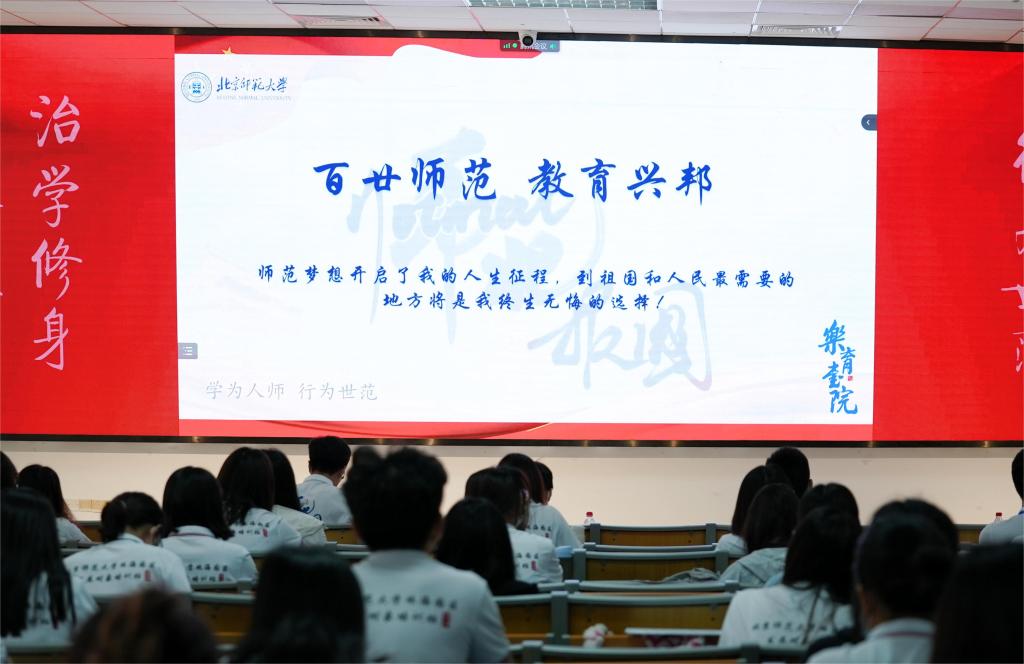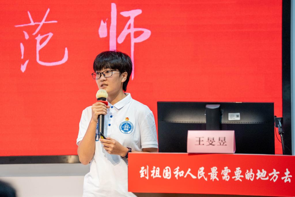 “优师计划”师范生代表王旻昱同学以自身的成长故事讲述了“教师是我的最优选”的感人心声,表达了将传承从容淡泊、儒雅随和、风趣幽默的师者风范,努力让自己成为一名既精通专业知识又涵养德行,精于“传道授业解惑”的“人师”,在北师大“红色师范”优良传统的浸润下,奏响新时代师范人的最强音!