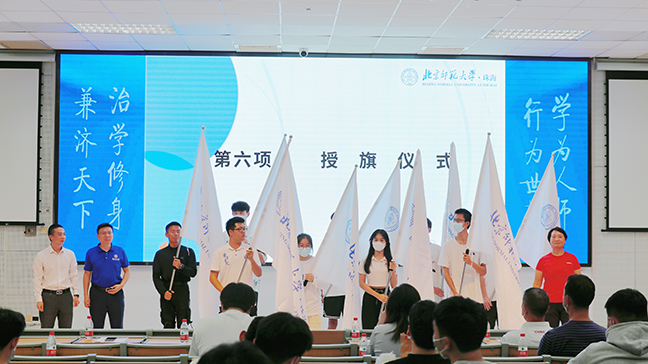 王琪老师、冯莉萍老师、陈乐老师向各项目运动员代表授旗。