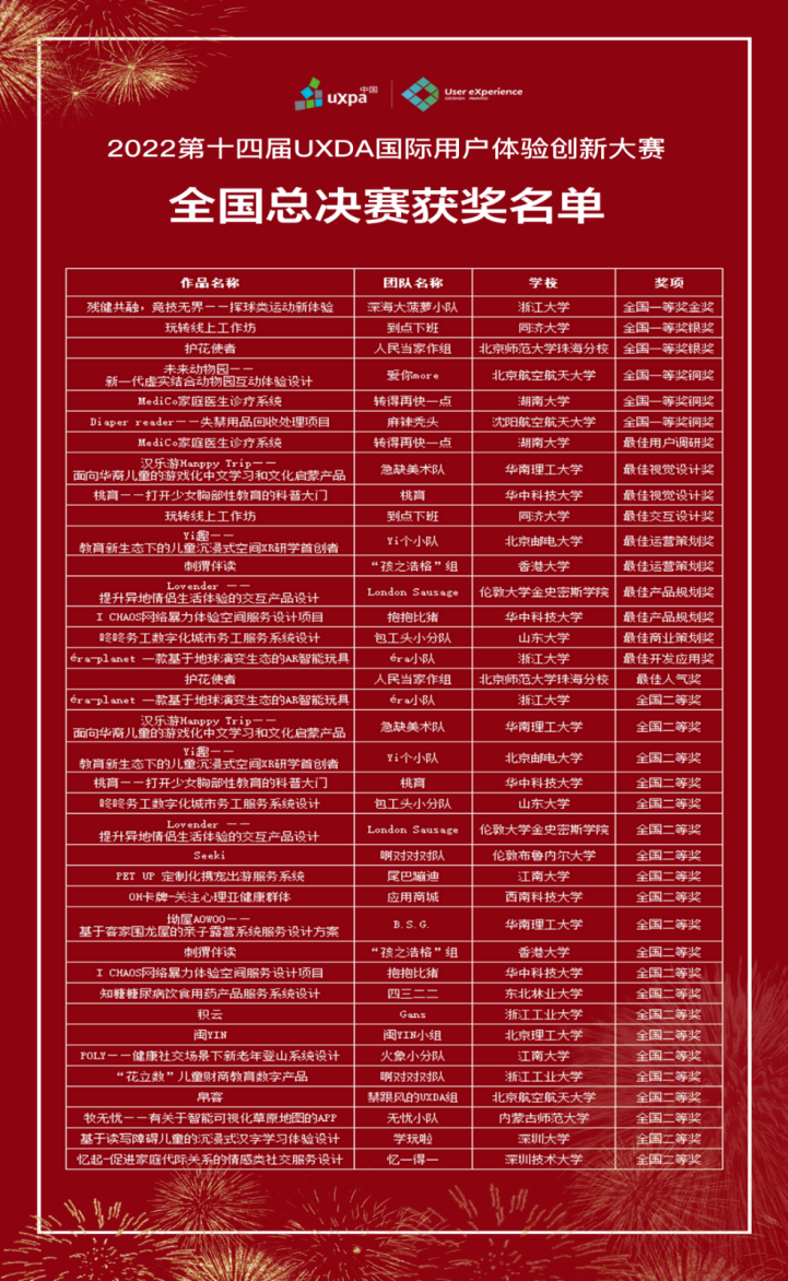 决赛当天,来自全球28所顶尖院校的学生进行了8个小时的激烈角逐,评委们根据选手作品的完成度、视觉效果、商业性等多个维度,评选出了6个全国一等奖,22个全国二等奖与三等奖若干。设计学院团队在全国决赛中斩获全国一等奖银奖和最佳人气奖的好成绩。
