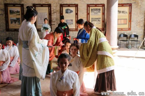 在“未来英国—英国大学生汉语夏令营”担任传统礼仪文化助教的经历同样让她很难忘。去年7月份,他们一行人要为前来交流的英国学生在会同村的大祠堂里举办成人礼。事前,他们要翻阅大量古籍,严格遵循礼制,按照古籍的描述来定制服装。那天老师们事先让他们吃了防中暑的药,因为天气真的很炎热。邵晓涵说,他们的衣服是湿了又干,干了又湿,尽管身体上有点消受不了,但是,看到外国的大学生第一次体验到我们传统文化的那一种溢于言表的喜悦之后,真的什么都值得了!这样一场别开生面的中华传统文化课,无论是对于前来的外国学生而言,还是对于邵晓涵一行人来说,都是不可多得,颇有意义的!