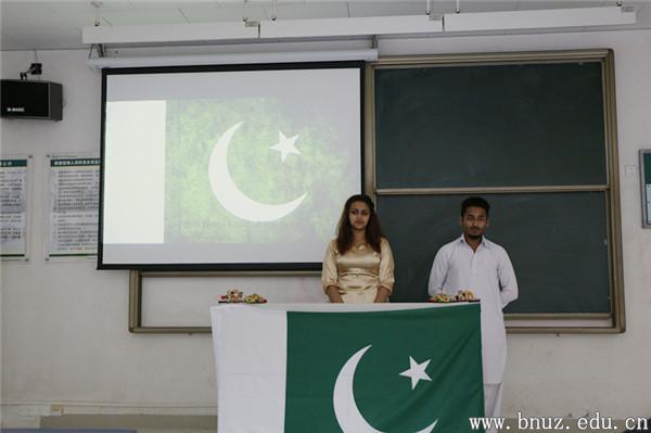 两名留学生从巴基斯坦的历史、地理位置等基本信息开始,向在场的同学全面介绍了巴基斯坦的概况。他们还从巴基斯坦的国旗和国徽入手,形象地介绍了巴基斯坦人口构成和分布;同时通过大量的图片和视频资料,让大家了解了巴基斯坦的风俗。