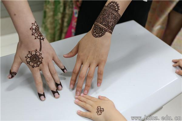 在互动环节中,同学们就中巴两国文化的相关问题进行了热烈讨论,并且踊跃回答主讲同学的问题。同学们还积极试穿传统服饰和试画汉娜手绘。据了解,汉娜手绘是一种古老的身体装饰艺术,它起源于印度,在东南亚、中东、北非等地区比较盛行。手绘艺术在印度最远可以追溯到5000年前,但也有专家认为它是12世纪随着阿拉伯文化及莫卧尔王朝的兴盛而转入印度。同学们表示,这一次的文化介绍让他们了解到巴基斯坦的真实情况。