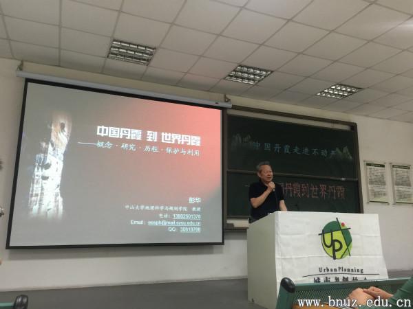 彭华教授的讲座从丹霞山地貌类型、形成过程、历史研究、丹霞系列构成、申遗之路、遗产价值和保护利用并持续发展七个方面展开。讲座持续了两个小时,彭华教授图文结合、声情并茂的演讲,感染着在座的每一位师生。