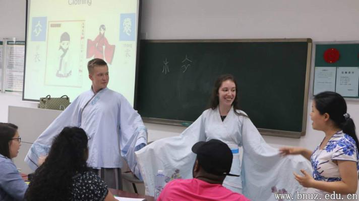 在语言文字课上,郭粲老师以汉字为切入口,从每一个汉字的源头说起,讲解汉字字形的演变,并以此来传授中国传统文化。此外,老师们还给留学生们安排了丰富的传统文化活动,其中感受汉服文化活动特别受留学生们的欢迎。通过试穿汉服,他们感受到了传统服饰文化的博大精深。