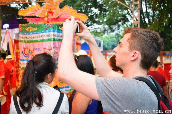 课程期间,外国学生们利用周末对孙中山故居、珠海淇澳岛、普陀寺、圆明新园等的历史古迹和文化景点进行了学习考察。端午节当天,留学生一行人到淇澳岛观看了省级非物质文化遗产淇澳端午祈福巡游,他们对端午巡游表现出了极大的兴趣。来自加拿大的留学生Kohl对淇澳端午祈福巡游做了全程的记录,他说:“自己主修的是中国文化专业,对中国的历史和传统文化非常感兴趣,以前从未见过类似活动,希望通过拍摄巡游过程并上传到社交媒体来传播这一传统的文化活动。”