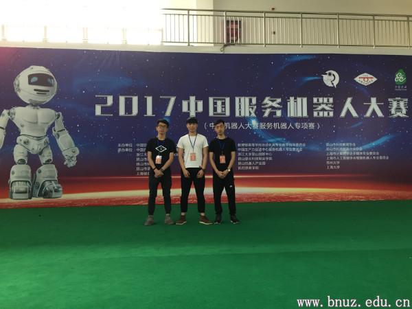 本网讯(通讯员 赵启超)5月19日-22日,由工程技术学院测控技术系2014级教育技术学专业黄志宽、吴育凯、谢泽鹏三位同学组成的“北师珠工程队”在赵启超老师带领下,参加了在江苏苏州举办的“2017年中国服务机器人大赛”,取得团体一等奖的佳绩。