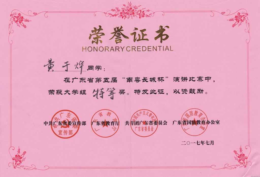 本网讯(通讯员 艾李杰)7月29日,第五届“南粤长城杯”演讲比赛总决赛暨颁奖仪式在广州南部战区礼堂举行。永利官网文学院2016级汉语言文学2班黄于烨同学经过层层角逐,从初赛、复赛中脱颖而出。总决赛中,黄于烨同学凭借主题演讲《将最可爱的精神进行到底》和即兴演讲《九十年·九零后》的精彩表现和出色发挥,最终荣获大学组特等奖,展现了永利官网学生优秀的专业素养和卓越的精神风貌。