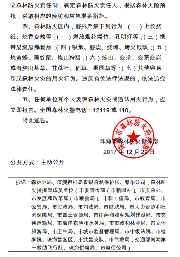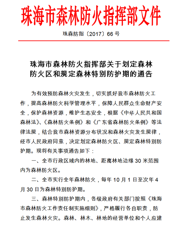 【公告通知】珠海市森林防火指挥部关于划定森林防火区和规定森林特别防护期的通告