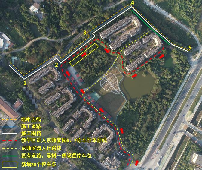 完成1-4段围挡施工,此段围挡施工完成后,从教学区进入京师家园6、7栋的车辆均按附图中的红线标示单向行驶。